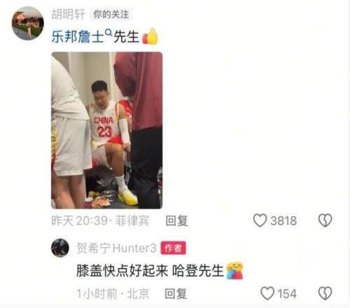 在这两场世预赛中,来自广东男篮的胡明轩都没有能够进入比赛大名单。起初不少球迷认为是胡明轩的状态问题,毕竟他本赛季表现一直比较一般。不过据贺西宁在社交媒体上给胡明轩留言中透露,胡明轩是出现了膝盖受伤的情况,希望他能够尽快痊愈。胡明轩的膝盖问题其实不是一天两天了,他之前就因为膝盖问题缺席过几场比赛。此次在中国男篮国家队集训,胡明轩的膝盖伤病应该是有些复发,郭士强这才没有让他进入比赛名单。