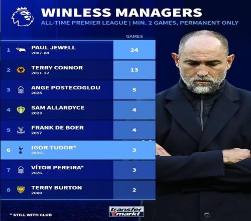 北京时间3月7日,在图多尔遭遇执教托特纳姆热刺开局三连败的情况下,德转统计出了英超历史新帅开局最长不胜排行榜,图多尔位列第6,波斯特科格鲁、阿勒代斯、弗兰克-德波尔以及维托尔-佩雷拉上榜。