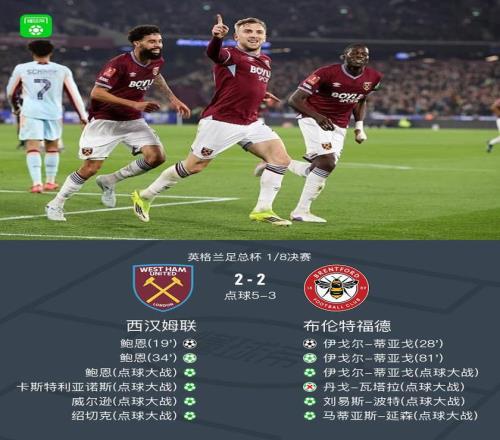 北京时间3月10日英格兰足总杯 1/8决赛,西汉姆联对阵布伦特福德。西汉姆联鲍恩梅开二度。布伦特福德伊戈尔-蒂亚戈梅开二度。最终比分西汉姆联 7-5 布伦特福德。
