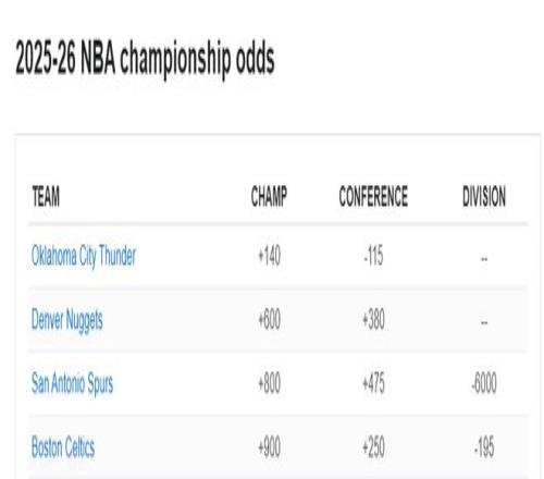 ESPN预测的夺冠赔率也更新,雷霆+140、绿凯+600、马刺+800,马刺也已经升第三。