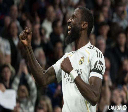 第39分钟,皇马获得任意球,维尼修斯一拨,巴尔韦德标志性起脚怒射,门将将球扑出,皮球来到吕迪格身前,德国后卫不停球撩射,打破僵局。