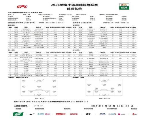 北京时间3月15日15:30,中超第2轮,河南主场对阵云南玉昆。赛前首发公布。