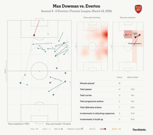 这项数据衡量了道曼在这场急需创造性火花的比赛中的影响力,也证明了阿森纳球员们——这是最大的认可——在每一个机会都将球交给他(他在23分钟内接到了17次传球)。