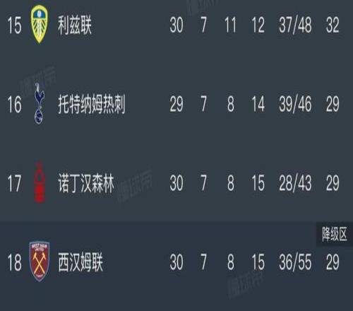 本轮英超开始之前,热刺积29分排名第16,领先身后的西汉姆联和诺丁汉森林各1分。
