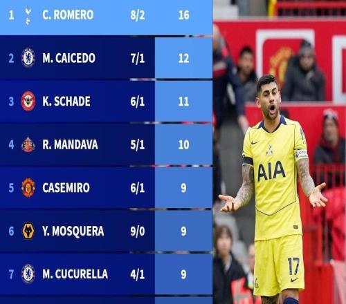 本赛季英超纪律榜:克里斯蒂安罗梅罗8黄2红得牌最多