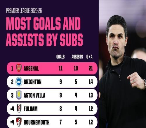 本赛季英超替补参与进球榜:阿森纳21球居首,曼城2球垫底